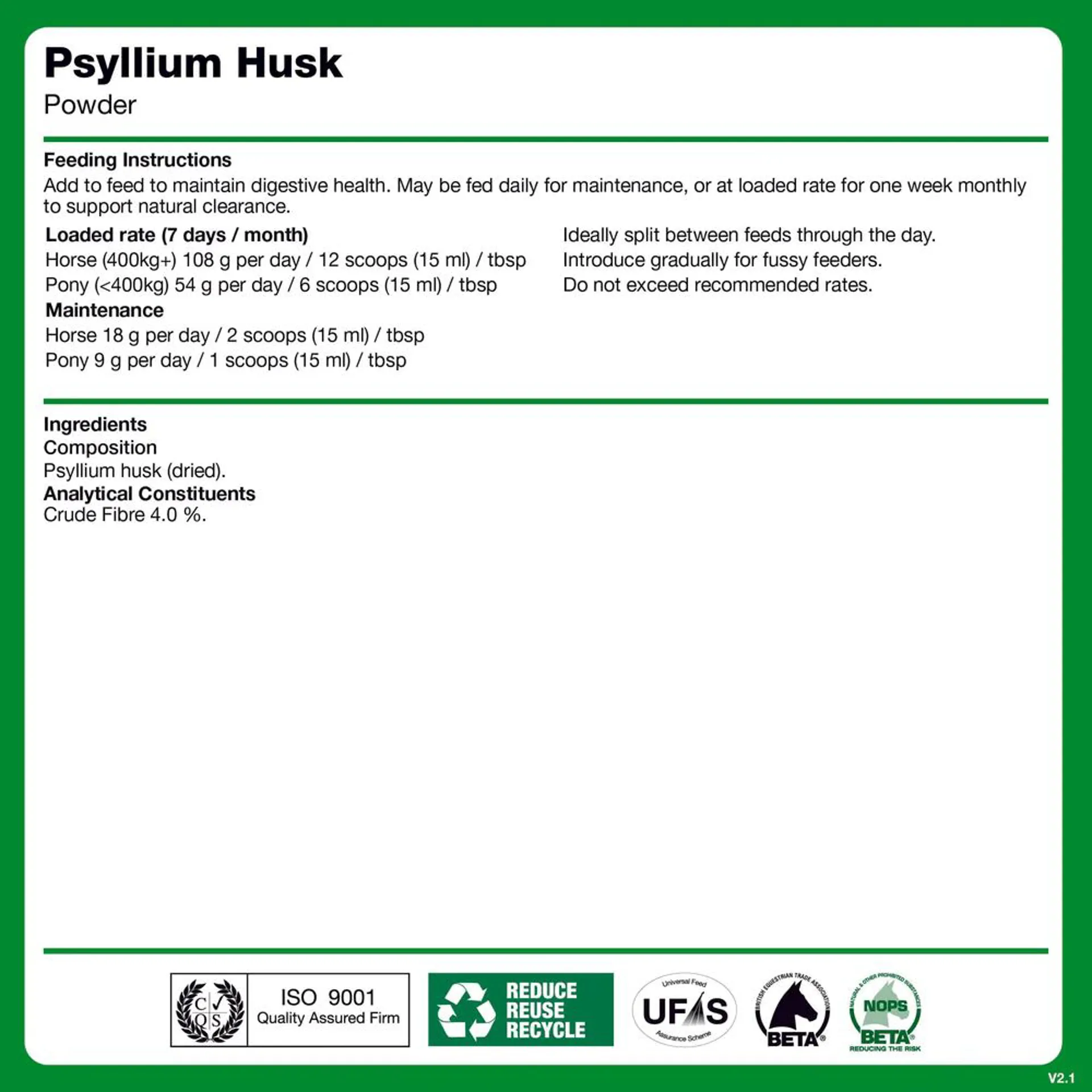 Psyllium Husk is a natural source of digestible fibre, recommended for those grazing on short or sandy pastures, it helps to promote the natural clearance of debris from the digestive tract.
